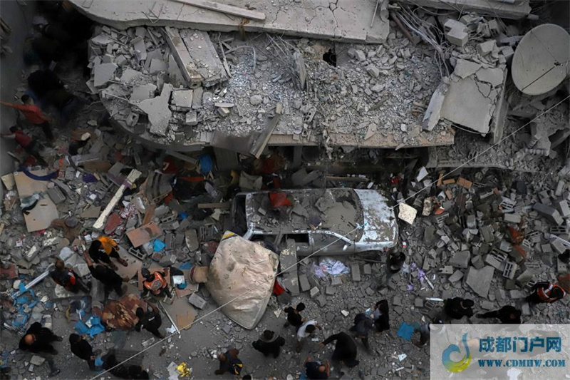 12月7日,在加沙地带南部城市汗尤尼斯,巴勒斯坦人查看遭以军袭击后的建筑废墟。新华社发(里泽克·阿卜杜勒贾瓦德摄)