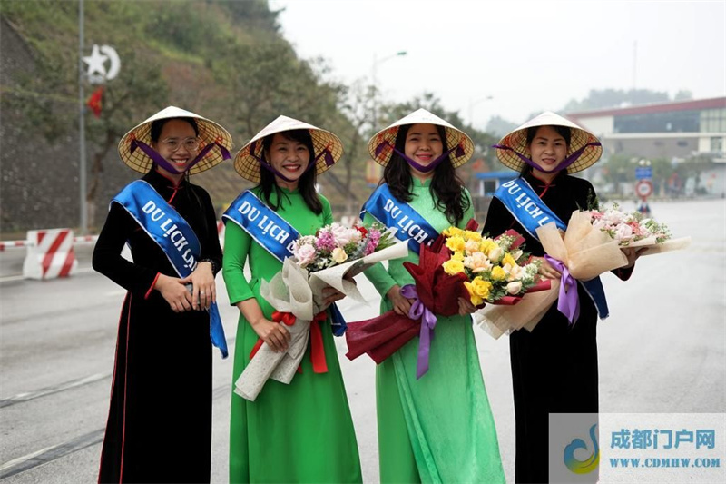 3月15日,越方工作人员在越南谅山省的友谊国际口岸手捧鲜花欢迎中国游客。(新华社记者胡佳丽摄)