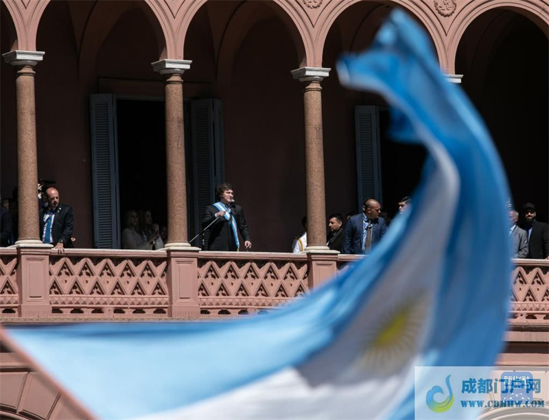 12月10日,在阿根廷首都布宜诺斯艾利斯,阿根廷新总统米莱在总统府玫瑰宫阳台上向民众发表演说。新华社发(赫尔曼·阿德拉斯蒂摄)