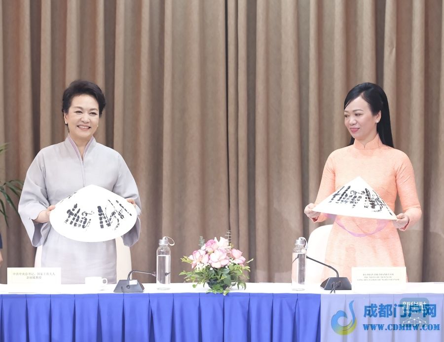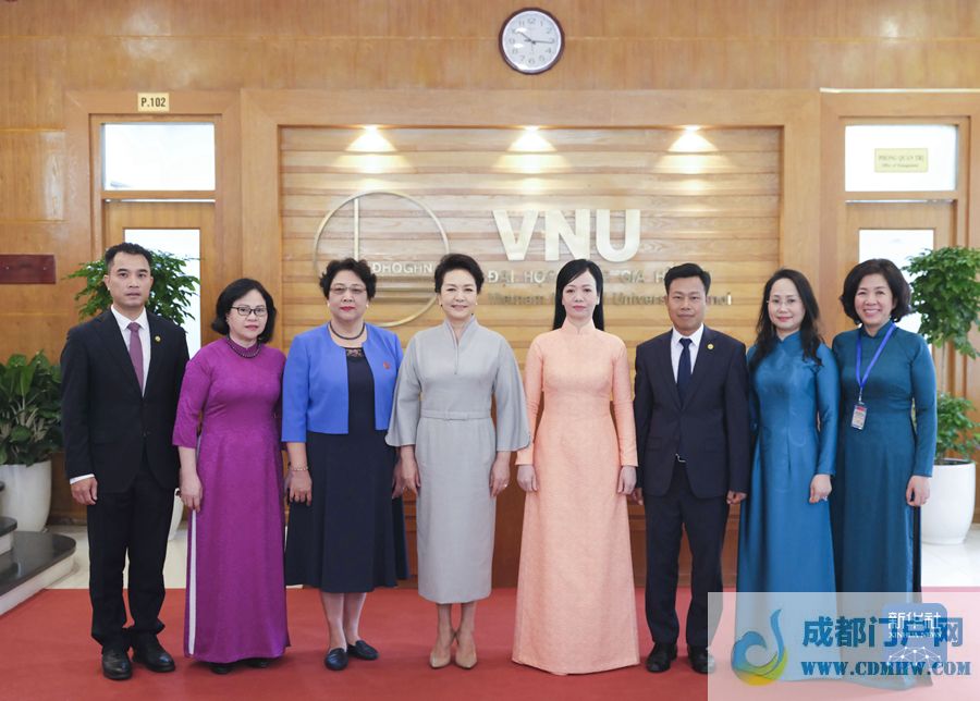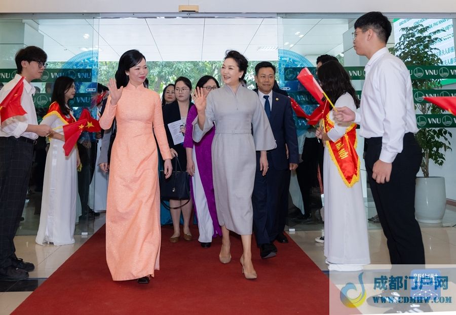 当地时间12月13日上午,国家主席习近平夫人彭丽媛在越南国家主席武文赏夫人潘氏清心陪同下参观河内国家大学。新华社记者 翟健岚 摄