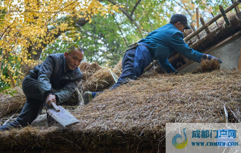 12月19日,在成都杜甫草堂茅屋故居,盖匠师傅用木梳板压实新铺的茅草。新华社记者 薛晨 摄