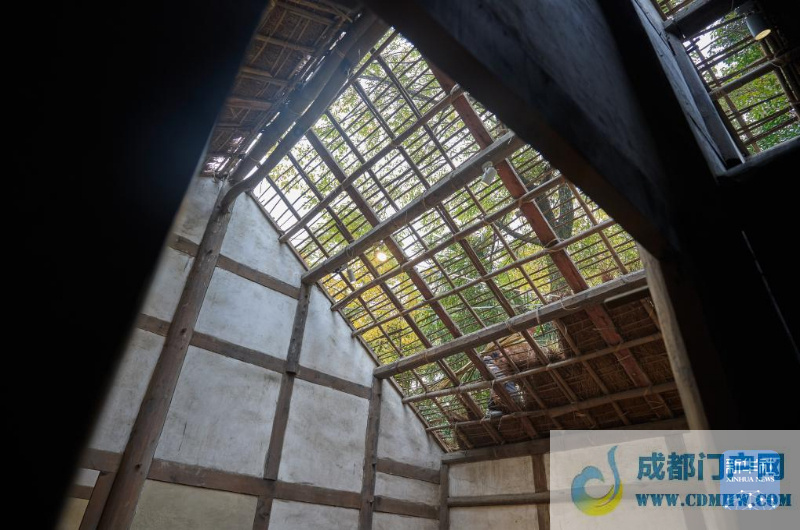 这是12月19日在成都杜甫草堂茅屋故居拍摄的拆除了旧茅草后的屋顶。新华社记者 薛晨 摄