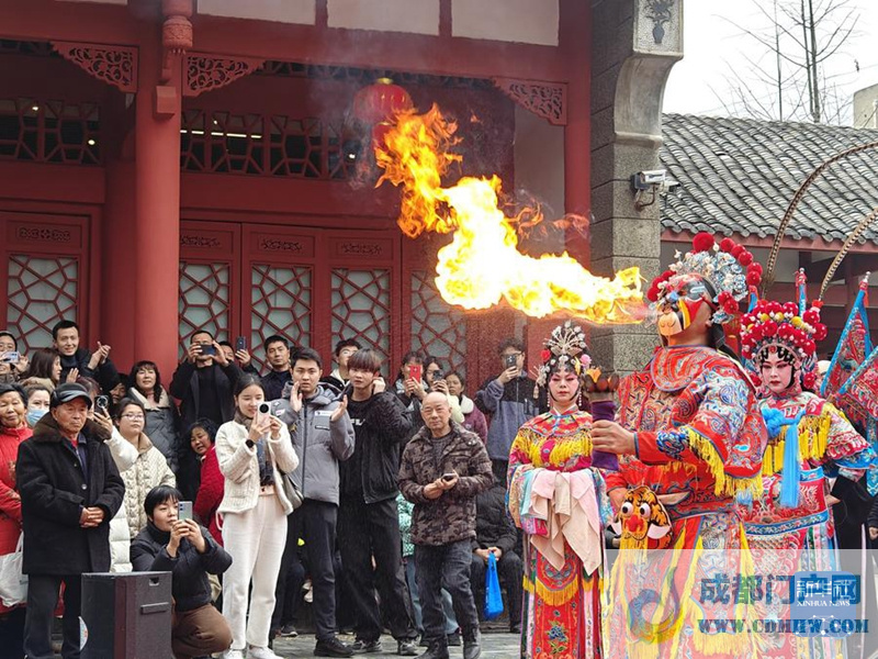 2月14日,川汉剧团演员为市民表演吐火。新华社记者谢佼 摄
