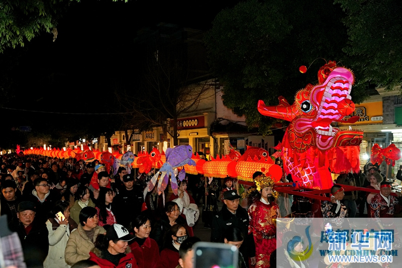 春节期间,汉服龙灯队非遗板凳龙巡游在城厢古镇上演。