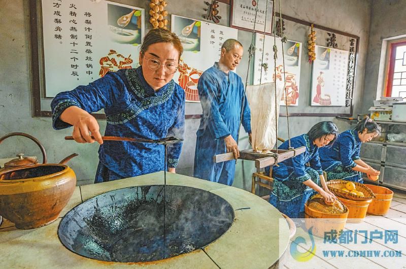 3月20日,仁寿县曹家镇梨树社区梨膏制作非遗传承人宋芬(左)在制作传承百年的梨膏。