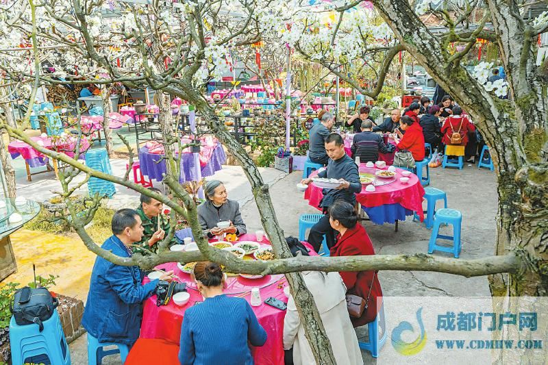 3月20日,游客在仁寿县曹家镇盛开的梨花下感受乡村风貌,品尝当地美食。