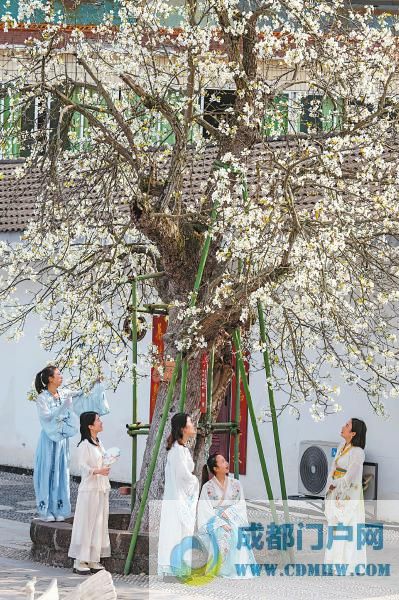 3月21日,身着汉服的赏花者在仁寿县曹家镇约400岁的梨树王下赏花、拍照。