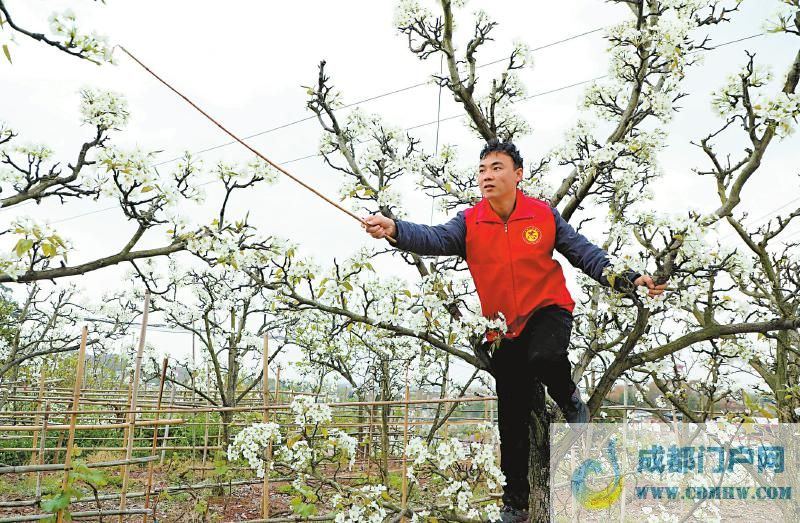 3月20日,党员志愿者在仁寿县曹家镇梨园村帮助果农进行梨花人工授粉。