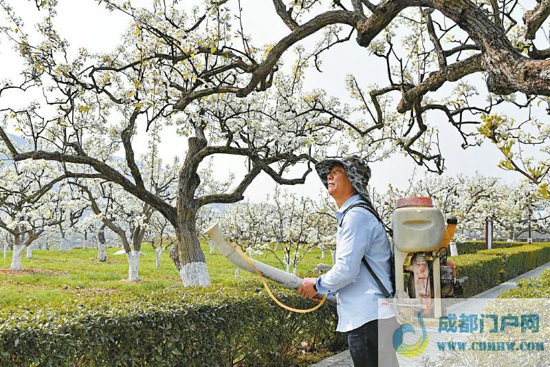 3月23日,苍溪县苍溪梨博园梨树管理人员正在对老梨树进行人工喷雾授粉。