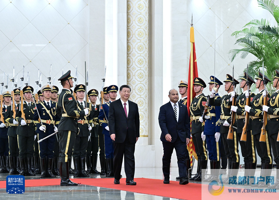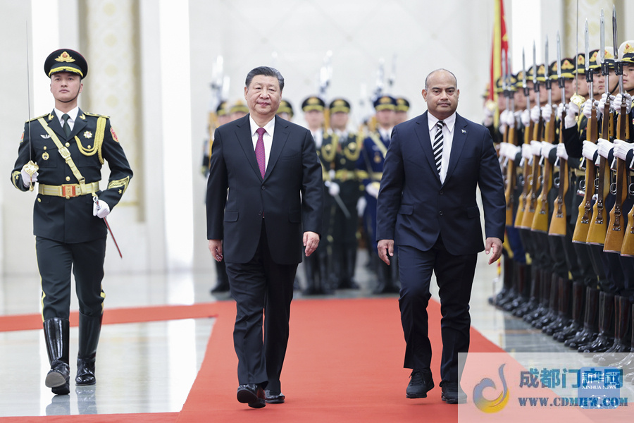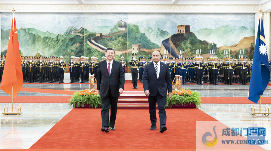 3月25日下午,国家主席习近平在北京人民大会堂同来华进行国事访问的瑙鲁总统阿迪昂举行会谈。这是会谈前,习近平在人民大会堂北大厅为阿迪昂举行欢迎仪式。新华社记者 翟健岚 摄