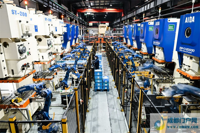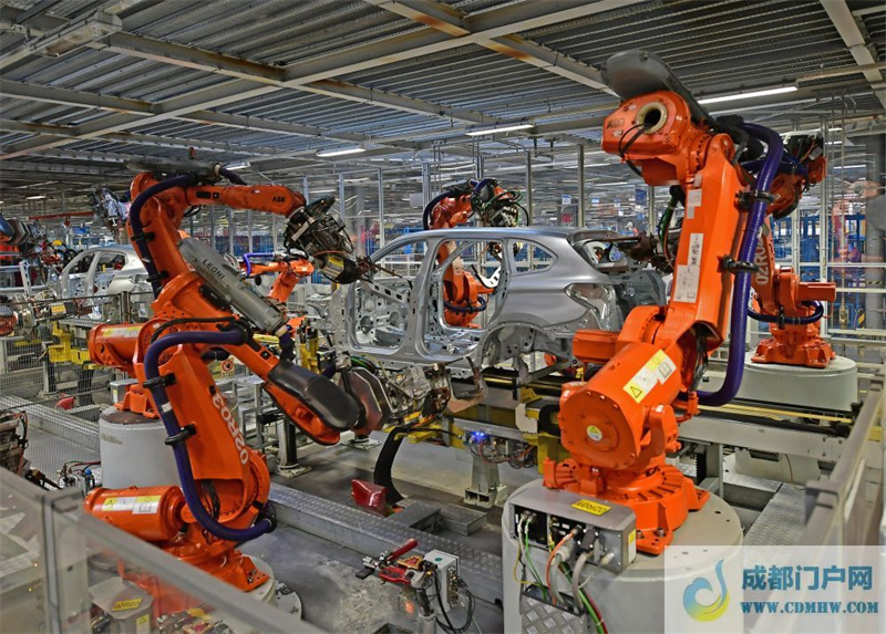 在华晨宝马沈阳铁西工厂车身车间,机器臂在焊接车身(2022年2月16日摄)。新华社记者 杨青 摄