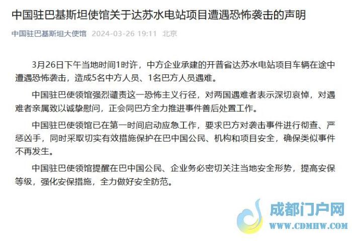声明表示,当地时间3月26日13时许,中方企业承建的开普省达苏水电站项目车辆在途中遭遇恐怖袭击,造成5名中方人员、1名巴方人员遇难。