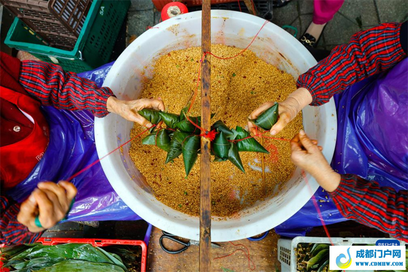 6月7日,在四川省成都市的“粽子一条街”上,一家粽子店的工作人员在包粽子。新华社记者 沈伯韩 摄