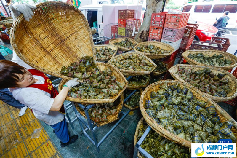 6月7日,在四川省成都市的“粽子一条街”上,一家粽子店的工作人员在摆放做好的粽子。新华社记者 沈伯韩 摄