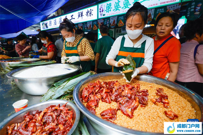 6月7日,在四川省成都市的“粽子一条街”上,一家粽子店的工作人员在包特色肉粽子。新华社记者 沈伯韩 摄