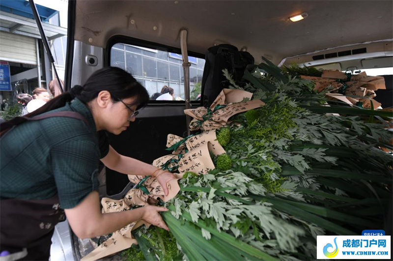 6月6日,在四川省成都市郫都区的一家花店,店员将包扎好的艾草花束装车为客户送出。新华社记者 胥冰洁 摄