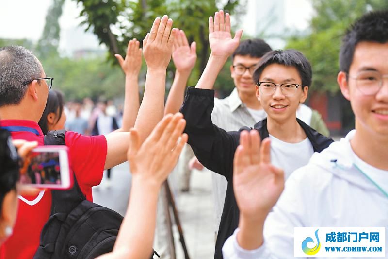 六月七日,在成都列五中学考点,进入考场的考生们和老师击掌鼓劲。记者向宇摄