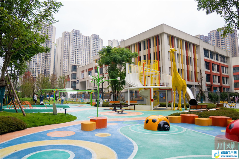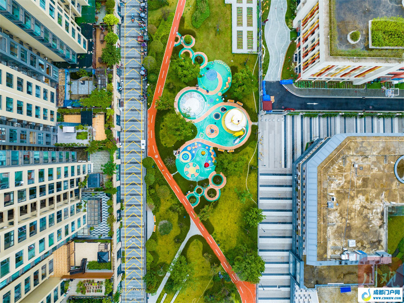 成都高新区二幼北侧游园绿廊儿童活动区。