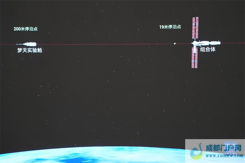 11月1日在北京航天飞行控制中心拍摄的空间站梦天实验舱与空间站组合体在轨完成交会对接。这是梦天实验舱从200米停泊点向19米停泊点靠近的模拟图像。新华社发(孙丰晓 摄)