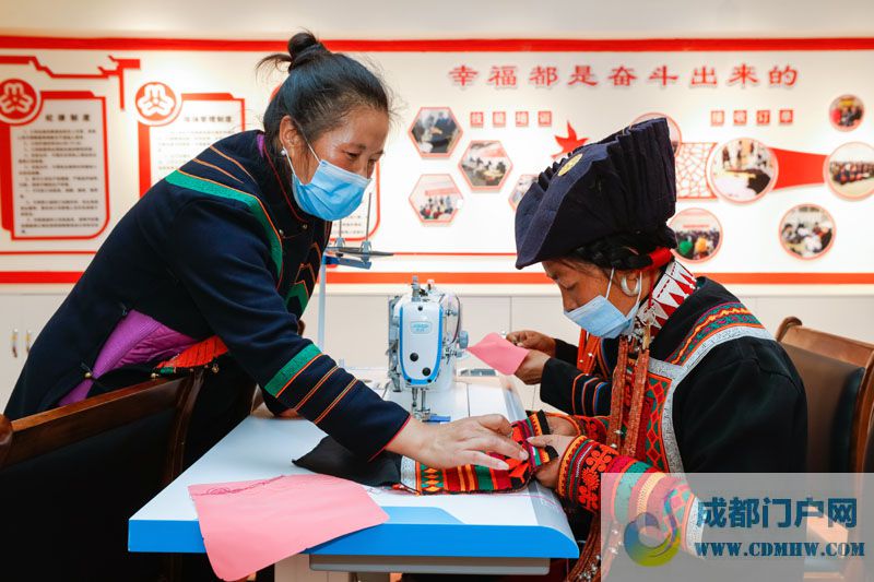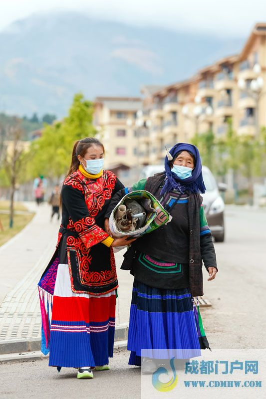 10月27日,在四川省凉山州昭觉县南坪社区,易地扶贫搬迁到此的妇女结束了在彝绣工坊的工作后回家。这个彝绣工坊有100多名绣娘,依照订单制作彝族传统服饰制品,绣娘们在此灵活就业,既能为家庭增收,又方便照顾家中老人和孩子,每年可增收数千至上万元。