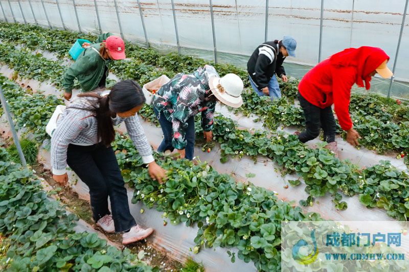 10月27日,在位于四川省凉山州昭觉县三岔河镇的九如草莓产业园,易地扶贫搬迁到此的居民在大棚里采摘草莓,他们每月可获得1000至2000元收入。