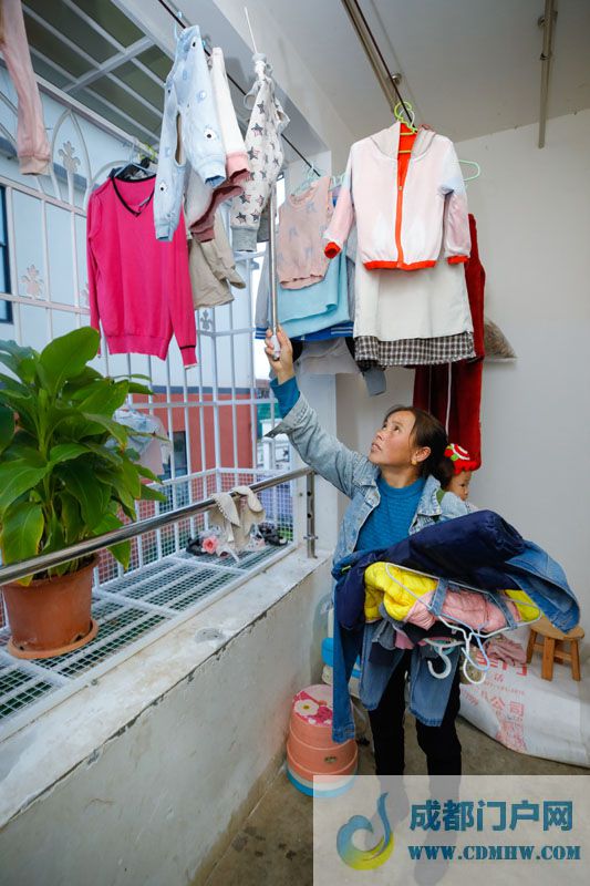 10月28日,在四川省凉山州越西县越城镇城北感恩社区,易地扶贫搬迁到此的沙马石各在阳台上收洗好的衣服,搬进楼房后她也用上了洗衣机。
