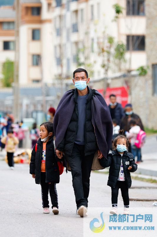 10月27日,在四川省凉山州昭觉县南坪社区幼儿园外,易地扶贫搬迁到此的居民接放学的孩子回家。幼儿园就在家附近,孩子们上学很方便。