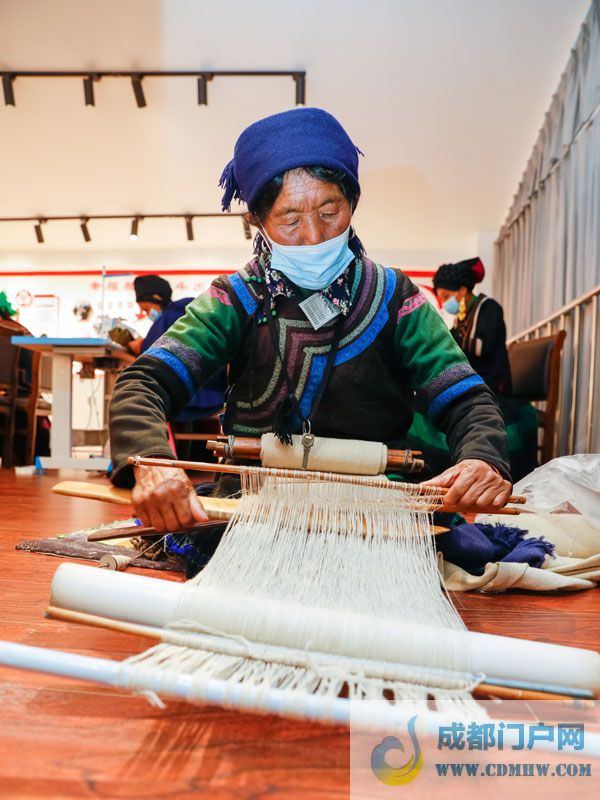 10月27日,在四川省凉山州昭觉县南坪社区的彝绣工坊,易地扶贫搬迁到此的妇女在纺织用于制作彝族传统服装“查尔瓦”的布匹。这个彝绣工坊有100多名绣娘,依照订单制作彝族传统服饰制品,绣娘们在此灵活就业,既能为家庭增收,又方便照顾家中老人和孩子,每年可增收数千至上万元。