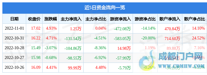 资金流向数据方面,11月1日主力资金净流入1.25万元,游资资金净流出472.08万元,散户资金净流入470.84万元。