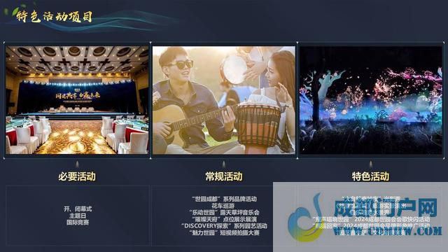 聚焦特色活动项目,此次世园会分为必要活动、常规活动、特色活动三大类别,其中涉及开闭幕式、主题日、国际竞赛、世园成都系列品牌活动、花车巡游、音乐喷泉水景秀、《花重锦官城》旅游实景演出等15项特色活动,邀请相关企业参与招募。