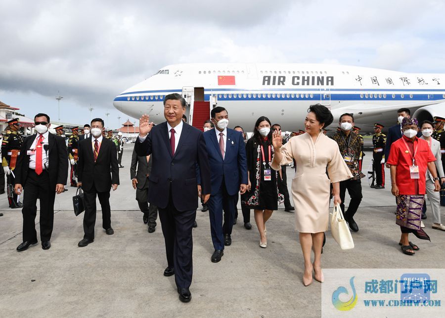 当地时间11月14日下午,国家主席习近平乘坐专机抵达印度尼西亚巴厘岛努拉莱伊国际机场,应邀出席二十国集团领导人第十七次峰会。这是习近平和夫人彭丽媛步出专机舱门。