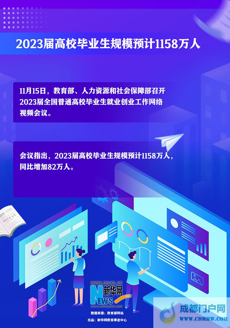 新华网北京11月15日电 今天,教育部、人力资源和社会保障部召开2023届全国普通高校毕业生就业创业工作网络视频会议。会议指出,2023届高校毕业生规模预计1158万人,同比增加82万人。