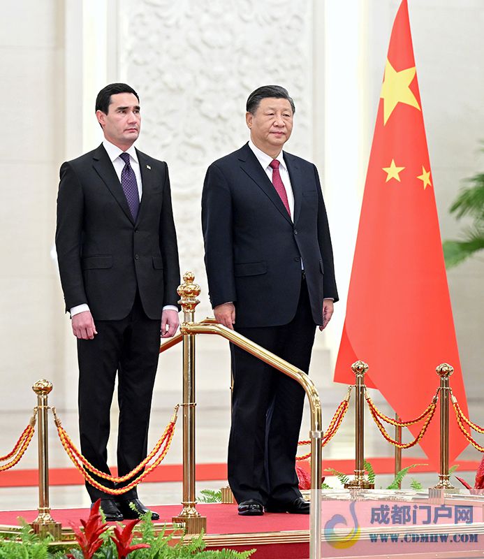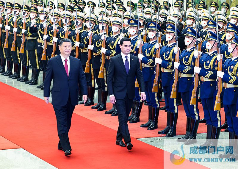天安门广场鸣放21响礼炮,礼兵列队致敬。两国元首登上检阅台,军乐团奏中土两国国歌。谢尔达尔·别尔德穆哈梅多夫在习近平陪同下检阅了中国人民解放军仪仗队,并观看分列式。