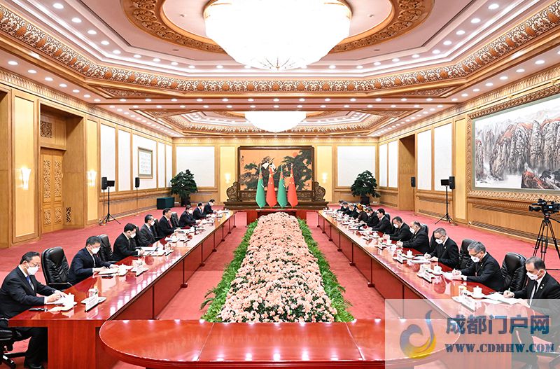 习近平指出,这是你就任总统后首次访华,今天又是中土建交纪念日,我们全面谋划中土关系下一步发展,共同宣布将两国关系提升为全面战略伙伴,意义重大。中国共产党正在团结带领全国各族人民以中国式现代化全面推进中华民族伟大复兴,土方正在积极推进土库曼斯坦复兴战略。中土两国理念相通,目标相似,利益相连,在发展振兴路上要携手努力,发挥互补优势,深挖合作潜力,实现共同发展。中方愿同土方一道,持续深化中土全方位合作,推动构建中土命运共同体,使两国关系在更高水平上向前发展。